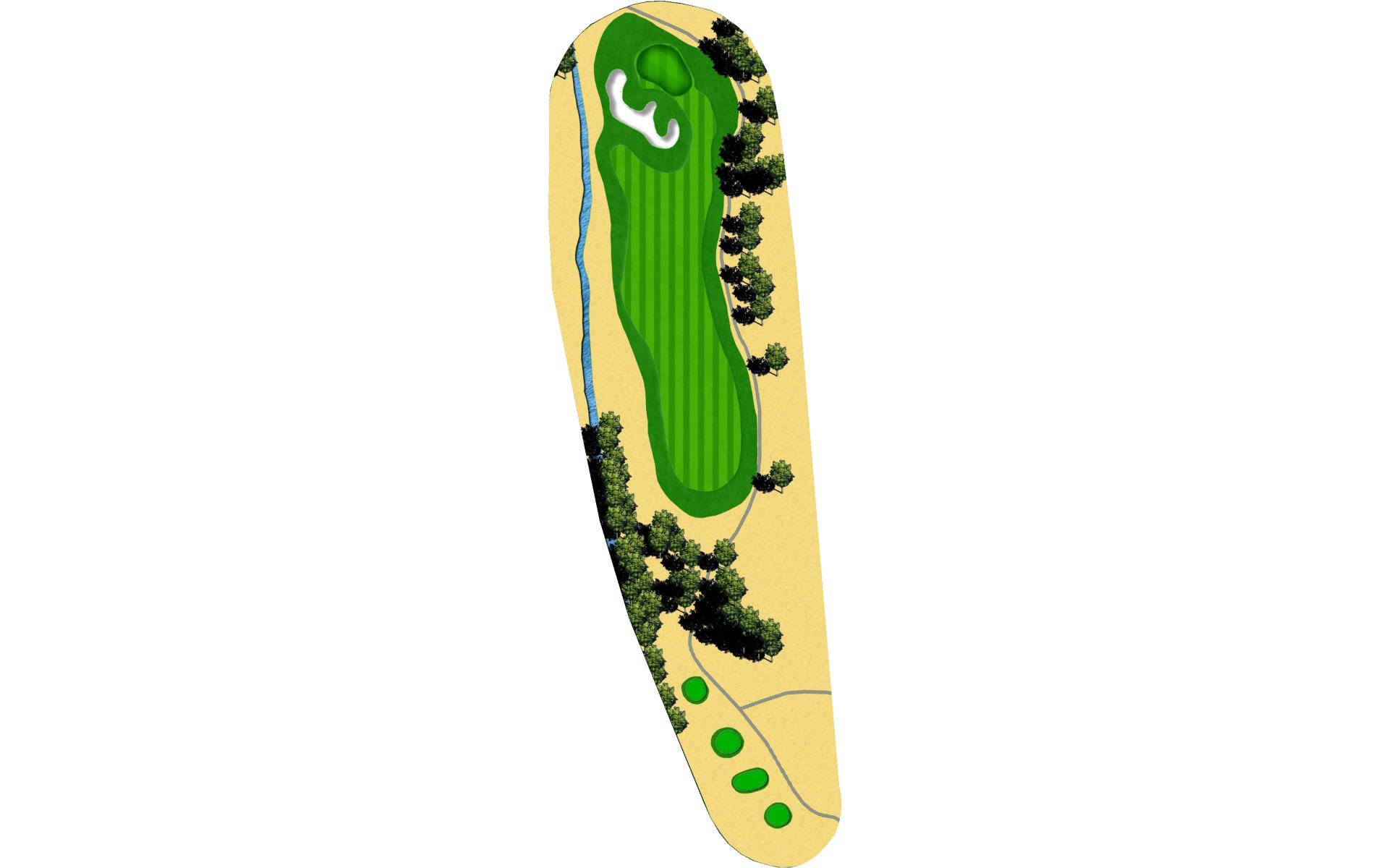 A tee shot down the right is the best play off this severe dogleg left par 4. A deep grass bunker awaits shots that try to cut the corner. An accurate iron shot is required to hit this back-to-front sloping green.