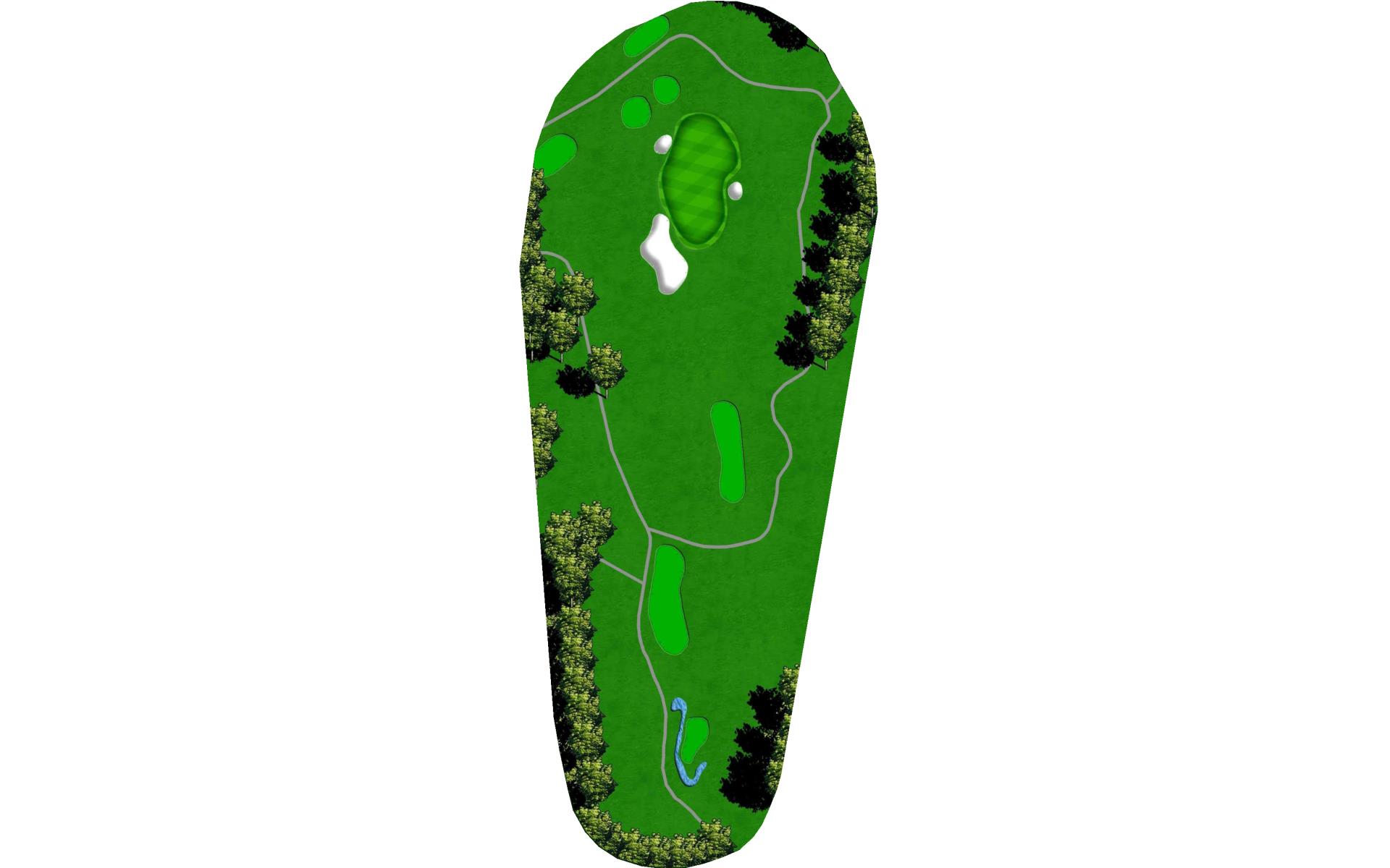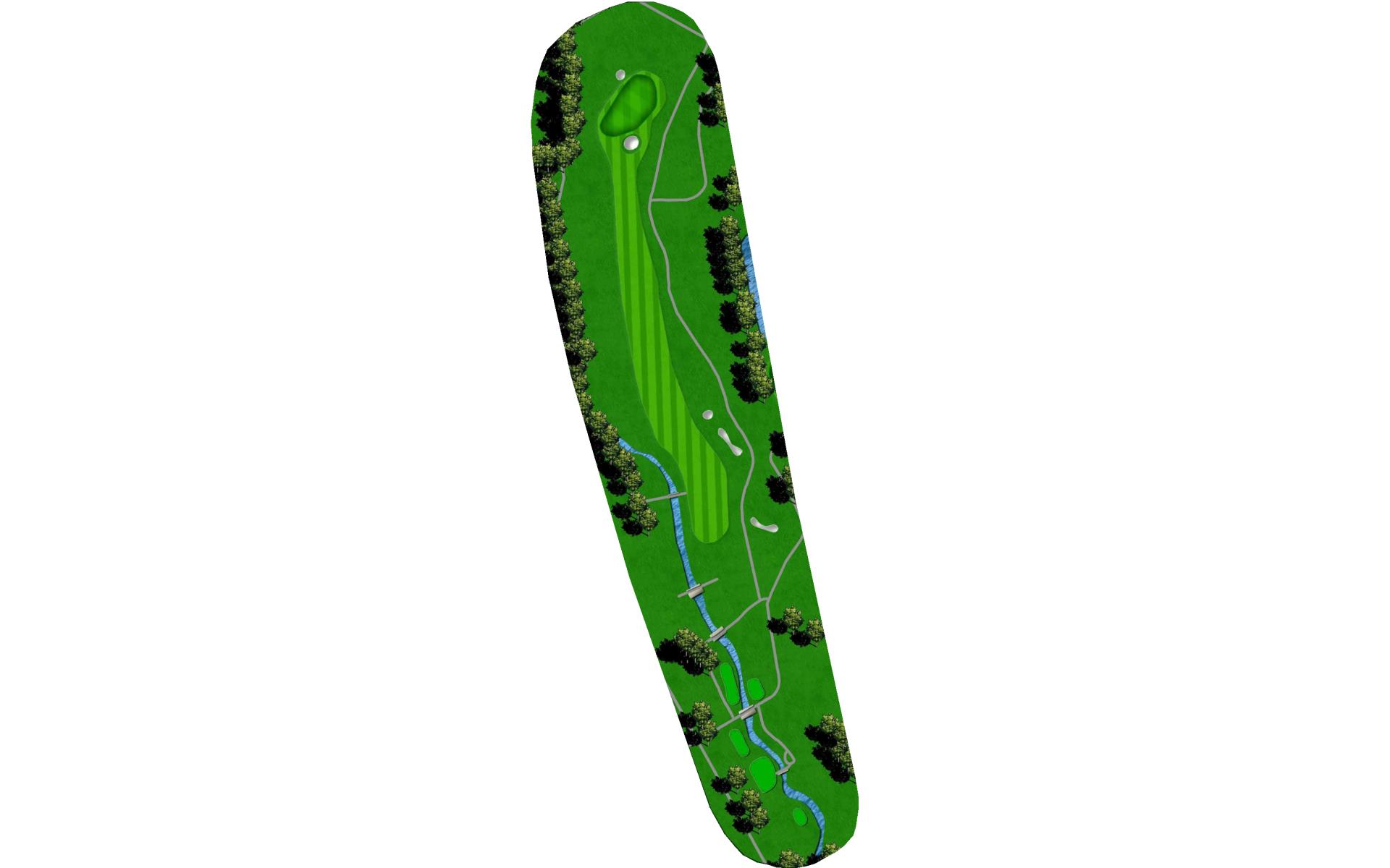 Solid par 4 finishing hole. Creek runs the length of the left side with fairway sloping towards hazard. Large mounds right help to catapult ball down the fairway. Avoid hitting it too far as second will be 50 ft below green surface. Well placed tee ball leaves 100yds and clear view of green. Precise second shot to proper tier required for good birdie chance.